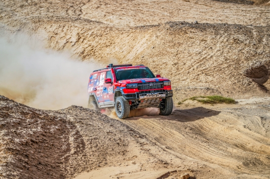 新增的SS2阿拉尔赛段全段穿越塔克拉玛干沙漠腹地,与SS4沙海老兵赛段相同,随时可能遭遇不可预料的沙尘暴天气。纵横G700凭借智能全地形模式、非承载式车身+三把差速锁等全地形越野能力,搭配悬架可MAX140mm,最小离地间230mm,最大320mm,全面保障极端路况下的稳定性与脱困能力。一往无前的车辙,呼啸着撕开沙浪,谱写出属于纵横G700的沙漠进行曲。