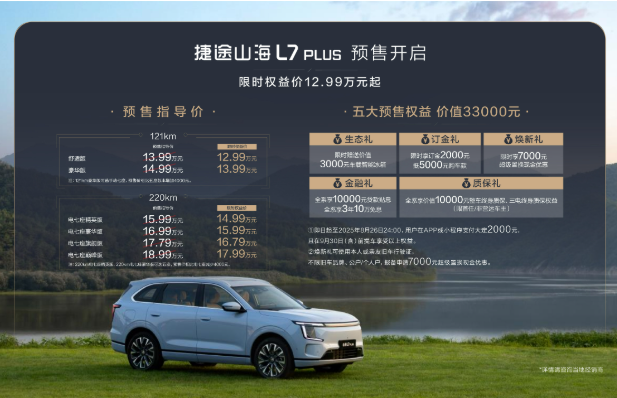 同时,捷途山海L7 PLUS正式开启预售,限时权益价12.99万元起。在此基础上,购车还享有价值33000元的五重预售权益,生态礼:限时赠送价值3000元的车载智能冰箱;订金礼:限时享订金2000元抵5000元购车款;焕新礼:限时享7000元超级置换现金优惠;金融礼:全系享10000元贷款贴息,全系享3年10万免息;质保礼:全系享价值10000元整车终身质保及三电终身质保权益(限首任/非营运车主)。山海L7 PLUS定位“长续航豪华电七座SUV”,全面覆盖用户的多元化需求,为用户带来超越期待的出行体验。
